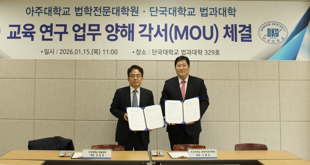 우리 대학 법과대학(학장 오승진)이 지난 15일(목) 죽전캠퍼스 법학관에서 아주대학교 법학전문대학원(원장 소병천)과 교육 및 연구 협력을 위한 양해각서(MOU)를 체결했다. △오승진 법과대학장(왼쪽)이 소병천 아주대 법학전문대학원장과 업무협약 체결 후 기념 촬영을 하고 있다. 양 기관은 이번 협약을 통해 ▲학부·대학원 간 교육 협력 ▲학술 세미나 및 워크숍 공동 개최 ▲산학협력 관련 공동 연구 참여 ▲지역 사회 봉사 등 다양한 분야에서 상호 협력하기로 합의했다. 특히 양 기관은 이번 협약의 핵심 과제로 ‘해외 AI 법률서비스 지원사업’을 공동추진한다. 이를 위해 양 대학 소속 교수진으로 구성된 공동 연구진 및 자문단을 발족할 계획이다. 자문단은 AI 기술을 활용한 법률서비스 수요가 급증하는 해외 지역을 대상으로 AI 기반 법률서비스의 적법성, 윤리성, 책임 구조 등에 대한 법률 검토와 자문을 수행하게 된다. 또한, 양 기관은 이 사업을 통해 교육과 연구의 연계도 강화한다. 사업 수행 과정에서 도출된 주요 쟁점을 바탕으로 공동 학술연구를 진행하고, 이를 특강 및 세미나 형태의 교육 프로그램으로 연계하여 교육과 연구의 선순환 구조를 구축한다는 방침이다. 오승진 법과대학장은 “이번 협약은 급변하는 법·기술 환경에 능동적으로 대응하는 교육·연구 협력 모델을 구축하는 계기가 될 것”이라며 “앞으로 국내외 법률 서비스 향상과 학문 발전에 기여할 수 있도록 노력하겠다”고 밝혔다. 한편, 법과대학은 법학세미나실, 법학전문도서관, 로스쿨 진학반 및 고시반(법선재) 운영 등 체계적인 교육 인프라를 갖추고 있다. 또한 무료 법률상담센터를 운영하며 지역 사회 공헌에도 앞장서고 있다. [대학뉴스 제보] 죽전 홍보팀 : 031-8005-2032~5, 천안 홍보팀 : 041-550-1061