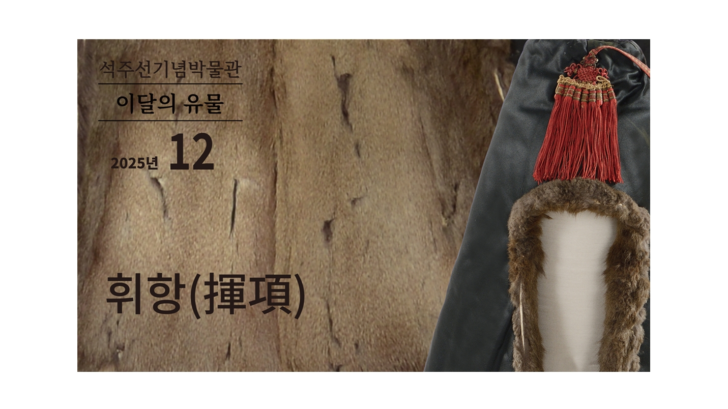석주선기념박물관(관장 박성순)은 1967년 개관(전신 중앙박물관) 이후 우리나라의 역사와 문화를 발굴·보급하는데 노력하고 있다. 박물관은 약 4만여 점의 유물을 소장하고 있으며, 구글아트앤컬처(Google Arts & Culture)를 통해 전 세계에 한국 문화의 우수성과 아름다움을 알리는 데 노력하고 있다. 박물관과 홍보팀은 공동으로 큐레이터가 추천하는 [석주선기념박물관-이달의 유물] 기획 특집 기사를 연재한다. 이달에 소개할 박물관 소장 유물은 「조선의 방한모, 휘항」이다. ▲석주선기념박물관 소장 ‘조선의 방한모, 휘항’ 조선의 겨울은 유난히 길고 추웠다. 선조들은 머리와 귀, 목을 동시에 보호할 수 있는 방한구를 발전시켰는데, 그중 대표적인 것이 휘항(揮項)이다. 휘항은 조선시대 남성이 착용하던 방한용 쓰개로, 호항(護項)·풍령(風領)·휘양(揮場) 등 다양한 명칭으로 불렸다. 휘항은 얼굴만 남기고 머리 뒤와 양쪽 귀, 그리고 목덜미 전체를 여유 있게 덮을 만큼 크고 넉넉한 형태이며, 앞쪽의 양옆에는 넓고 긴 끈이 달려있어 앞에서 단단히 여밀 수 있다. 외출 시 차가운 바람으로부터 신체를 효과적으로 보호할 수 있었다. 휘항은 재질과 용도에 따라 다양하게 제작되었다. 겨울철에는 비단 겉감과 모피 안감을 갖춘 ‘털휘항[毛揮項]’이 상류층에서 주로 사용되었으며, 실용성과 경제성을 중시한 ‘무명휘항[木揮項]’은 면직물을 사용해 일상적으로 활용됐다. 또한 환절기에는 얇은 사(紗)를 사용한 ‘양휘항(涼揮項)’ 등 계절에 따른 착용 편의를 고려한 다양한 형태가 나타났다. ▲ [왼쪽] 흑립 아래 휘항을 착용하고 말을 타고 가는 선비 모습(※출처 심사정 ‘책건우려’) [오른쪽] 책가도 중 휘항을 걸어 둔 모습(※출처 국립민속박물관) 석주선기념박물관 소장품인 휘항은 겉감은 검은색 계열의 비단(흑공단)을 사용하고 토끼털을 안감으로 사용해 전체에 대어 주었다. 전체 길이는 약 62.5cm, 하단 둘레는 약 60cm로 머리와 목뿐 아니라 어깨까지 충분히 덮는 크기다. 앞에 넓고 긴 끈을 달고 안쪽에는 가늘고 짧은 끈을 달아 충분히 여며지는 것은 물론이고 외형적인 위엄을 갖도록 해서 기능과 디자인을 모두 고려한 구성이다. 또한 장식을 위해 앞뒤에 붉은색의 봉술을 끈목으로 연결했는데, 붉은색 봉술은 시각적 화려함을 더하는 요소로, 앞쪽에 9개, 뒤쪽에 7개를 배치하여 좌우 균형감과 위엄을 강조했다. 휘항은 조선 사대부의 위엄과 실용성을 모두 보여주는 귀중한 유물이다. 휘항은 정수리 부분이 비어 있는 독특한 구조를 가지는데, 이는 겨울철에도 관모(흑립 등)를 반드시 착용해야 했던 조선의 관모 예제(禮制)를 준수하기 위한 설계로, 방한성과 예장(禮裝)을 동시에 확보한 형태다. 오늘날 남아 있는 휘항 유물은 많지 않지만, 남아 있는 몇 점의 실물은 조선 장인의 바느질 기법, 모피 안감의 풍성한 질감 등의 아름다움을 잘 보여준다. 휘항은 단순한 방한구를 넘어, 조선의 일상에서 실용과 미감이 어떻게 조화를 이루었는지를 보여주는 중요한 문화유산이다. [대학뉴스 제보] 죽전 홍보팀 : 031-8005-2032~5, 천안 홍보팀 : 041-550-1061