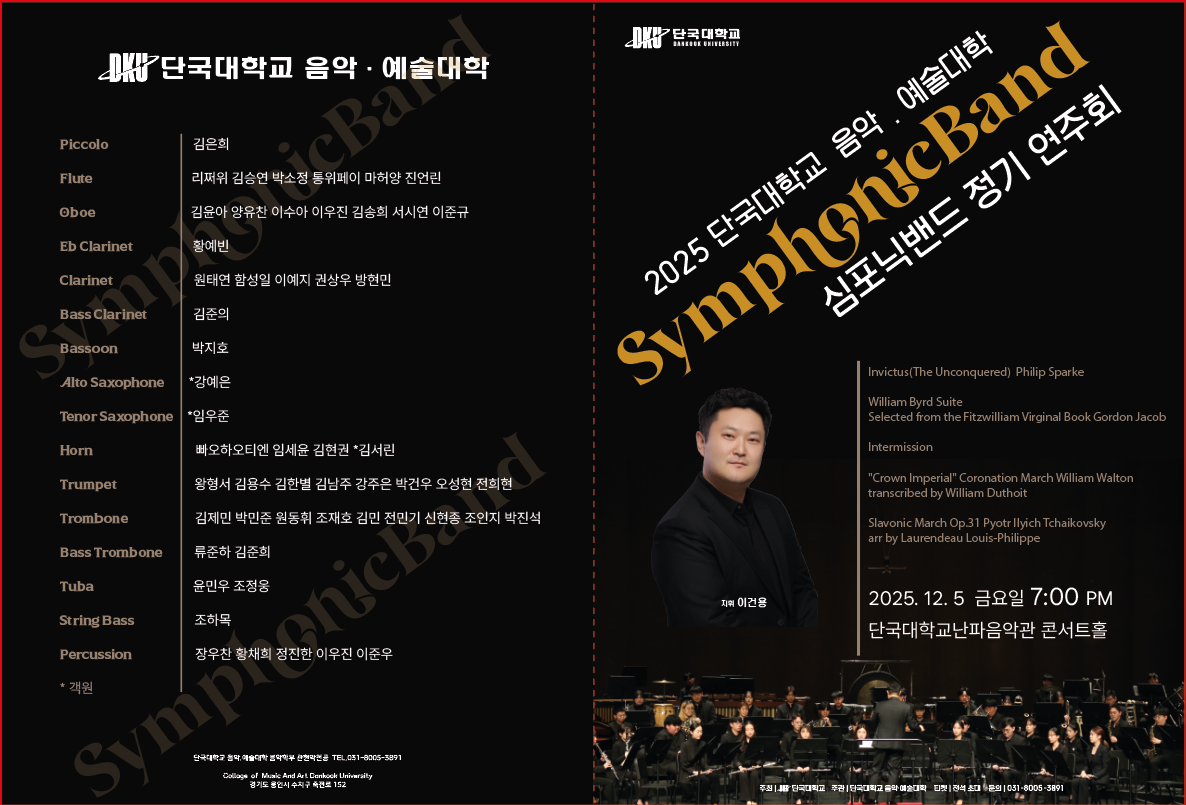 오는 5일(금) 난파음악관 콘서트홀서 심포닉 밴드 정기연주회 개최 음악학부 심포닉 밴드가 연말을 맞아 깊이 있는 클래식 무대를 선보인다. 오는 5일(금) 오후 7시, 난파음악관 콘서트홀에서 이건용 교수(음악학부)의 지휘 아래 「2025 심포닉 밴드 정기 연주회」가 열린다.