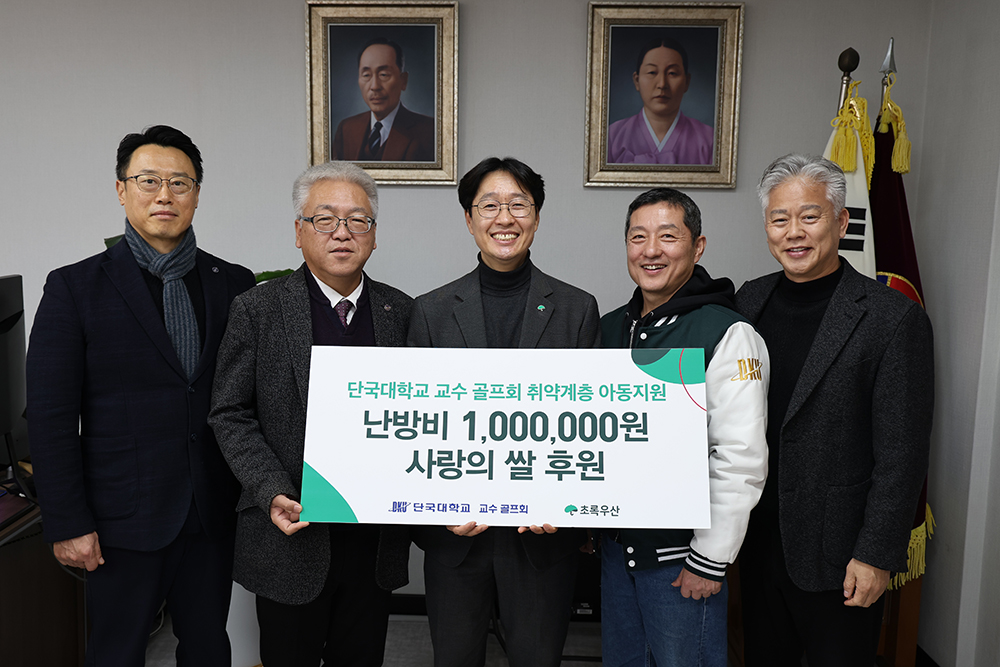 △(왼쪽부터)김기홍 교수, 백동헌 천안부총장, 김우현 초록우산 충남지역본부장, 허승욱 공공인재대학장, 이일석 학생처장이 후원을 기념해 사진을 촬영했다. 우리 대학 교수 골프회에서 겨울철 한파로 어려움을 겪는 취약계층 아동을 위해 따뜻한 나눔을 실천했다. 교수 골프회는 29일 천안캠퍼스 부총장실에서 후원 전달식을 열고, 십시 일반으로 걷은 난방비 100만 원과 소정의 쌀을 기탁했다. 이번 후원은 경제적 어려움으로 겨울철 난방에 부담을 느끼는 취약계층 아동 가정을 지원하기 위해 마련됐다. 전달식에는 교수 골프회 소속 교수들이 함께 참석해 나눔의 의미를 더했으며, 후원 물품은 지역 내 취약계층 아동 가정에 전달될 예정이다. 백동헌 천안부총장은 “교수님들의 작은 정성이 모여 아이들에게 따뜻한 겨울을 선물할 수 있게 돼 뜻깊다”며 “앞으로도 대학 구성원으로서 지역사회와 함께하는 나눔 활동을 꾸준히 이어가겠다”고 밝혔다. [대학뉴스 제보] 죽전 홍보팀 : 031-8005-2032~5, 천안 홍보팀 : 041-550-1061